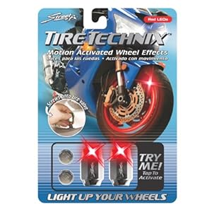 This product has the motion activated wheel effects. Package includes ultra bright LEDs and batteries. This product screws onto the tire valve stems and creates a ring of light when the wheel is moving. They are available in three styles red, blue, green and alternating red/white/blue. They are available in skull and crossbones shape with blue LEDs. Rainbow LEDs is available in micro shape. Additional adaptor may be required for brake caliper and fender clarence.